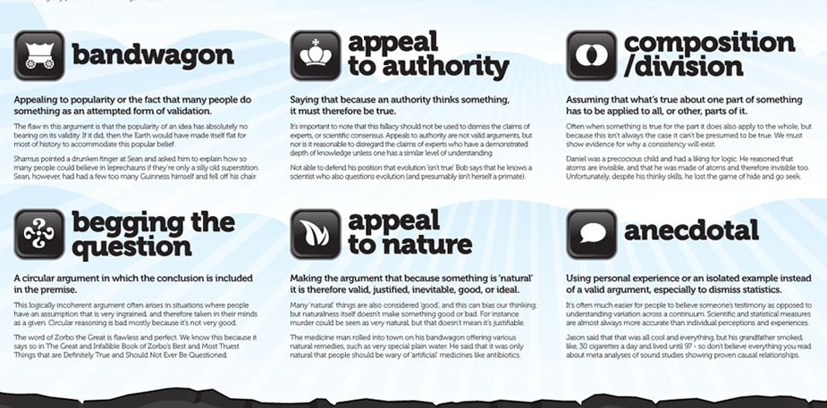 Ultimately, the above is an example that is used in politics. However, logical fallacies invade every debate (social, economic, political, scientific…), and all of this is really just about thinking critically. There are good arguments and their are bad arguments, and part of being a good scientist is being able to weigh an argument, tell what evidence is acceptable, and being able to think critically about (be justifiably skeptical of) the information and ideas that one is presented with. So give this graph a look, and see how many common fallacies you can think of. Then scroll down to see some of the more common bad arguments that people use in the sciences (click for a larger version).