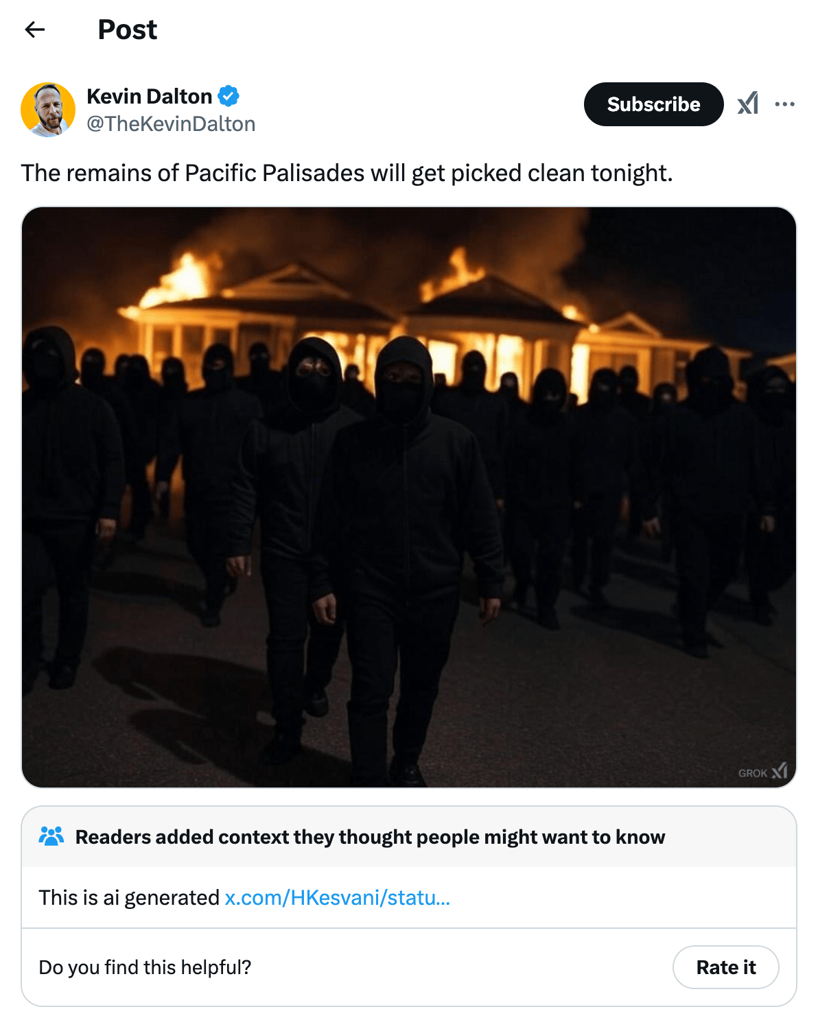 Other AI slop relating to the ongoing natural disaster is even more insidious. In an apparent effort to sow discord and score points with the platform’s more gullible and potentially racist users, a user going by the name Kevin Dalton shared an image of shadowy figures that seem to be looting the devastation of burning buildings.