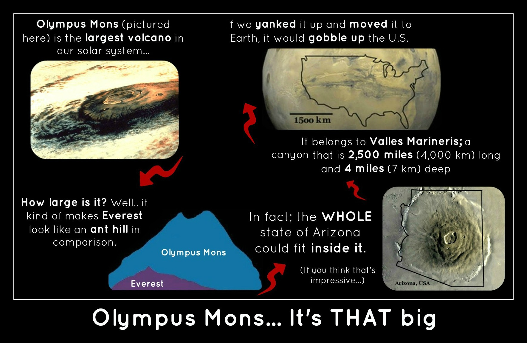- A comparison between Olympus Mons and the largest mountains on Earth and Venus. (Credit: Mark A. Garlick)