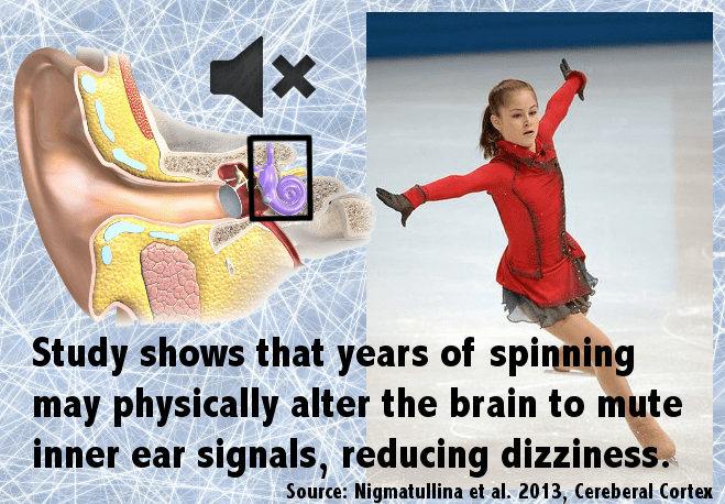A 2013 study published in the journal Cerebral Cortex suggests that Yulia’s brain is probably a bit different than mine. Years of spinning practice may have actually conditioned her brain to ignore dizzying signals. Every time we move, our “vestibular system” keeps track of it. Fluid sloshes around the inner ear, overtop tiny hair cells that sense the fluid and relay its movement to the brain as electrical signals.