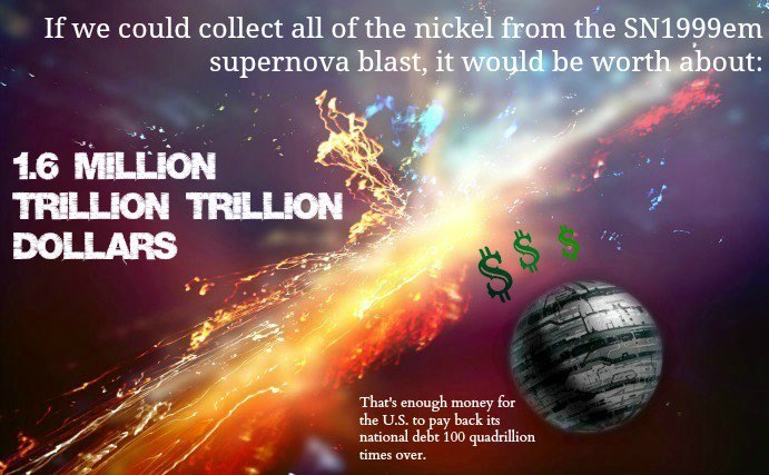 Of course, the abundance of nickle would actually bring down the value of nickel. So sadly, the nickle wouldn’t really be worth all that much in the end. Also, as previously mentioned, all that nickle would be the size of Jupiter, so we wouldn’t be able to fit it on our planet. And it is 25 million light-years away, so it would literally take us billions of years to get there and cost us an astronomical amount of money (likely driving the entire planet into bankruptcy before we ever got there). And the nickle was dispersed in the supernova blast, meaning that it is spread out across the cosmos…making gathering it a little difficult.