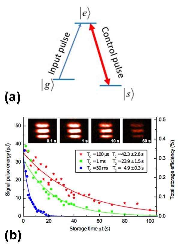 Figure 1: (a) Energy-level scheme for EIT experiments: two ground states (|g〉 and |s〉) are connected to one excited state (|e〉) by an optical transition. To reach the EIT condition, the frequency difference between the input and control beams must be equal to the splitting between |g〉 and |s〉. (c) Output pulse energy and storage efficiency as a function of the storage time, as measured by Heinze et al. [1] for three coherence times (T2) obtained under different sequences of radio frequency pulses. The inset shows a three-stripe image retrieved from the memory after different storage times.