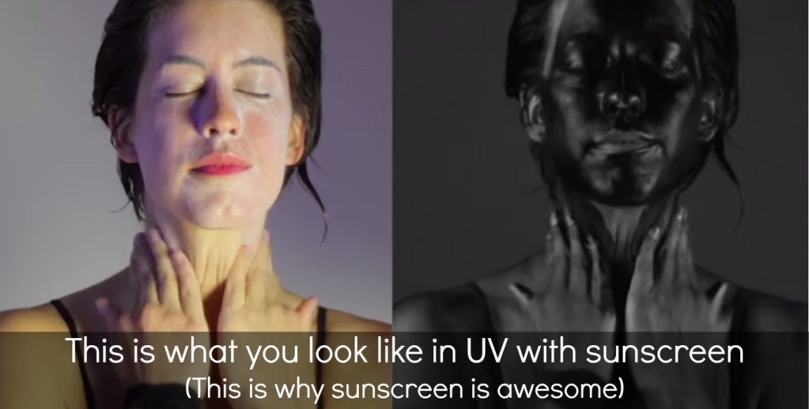 A month or so ago, a crazy article was running around claiming that sunscreen causes cancer (which we debunked). Sun-induced skin cancer is usually caused by ultraviolet (UV) light. One of the powerful things about sunscreen is it blocks this light, preventing it from interacting with our skin, and protecting us from that type of cancer. Have you ever wondered what you look like with and without sunscreen in ultraviolet light? Probably something like this…