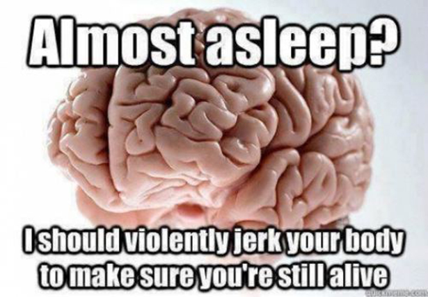 Nobody knows why these robbers of sleep occur. There are, as always, some hypothesis to explain them. It’s possible sleep starts are a result of the relaxing of muscles. Other theories suggest that, as the body drifts to sleep, the brain interprets various temperature and breathing changes as falling. One of my personal favorites is the theory which says the body doesn’t know the difference between falling asleep and dying, so (as the picture says), your brain violently jerks your body to make sure you’re still alive and to keep everything functioning.