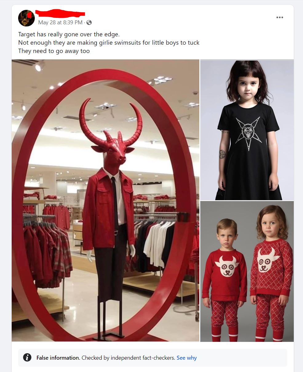 Far-right Facebook was sent spiraling last week over so-called images of children wearing what looked to be Target merchandise covered in Satanic imagery. These people, however, are idiots, and all of the images in question — which also included depictions of Satanic horned mannequins, because that’s also something that a major retailer would definitely put in suburban shopping centers — were AI-generated fakes.