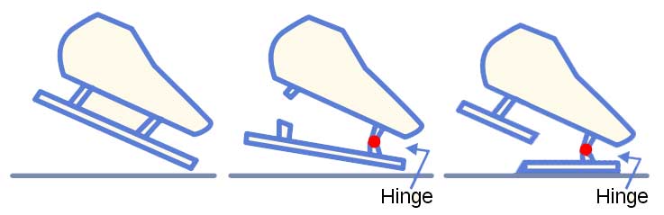 How is this corrected? By making the blade on the skate able to pivot under the ball of the foot, allowing the skater to extend the ankle while the blade stays more parallel to the surface of the ice. So the front strut of the blade was given a hinge, the back strut cut in two and thus the Clap Skate was born.
