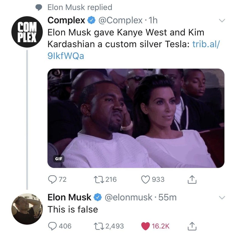 Complex tried to say in a (since-deleted) tweet that the ride came straight from Tesla’s CEO, but Musk shut that down right quick: