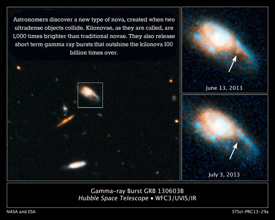 The first proof of the existence of kilonovae came just last month, as NASA’S “Swift Space Telescope” noticed an extremely bright gamma-ray burst, located more than 4 billion light-years from Earth. The burst, cataloged by NASA as “GRB 130603B,” lasted merely one tenth of a second (classifying it as a short-term gamma-ray burst). After this event, another flash was noted, one that was 100 billion times less luminous than the gamma-ray burst seen just moments earlier.