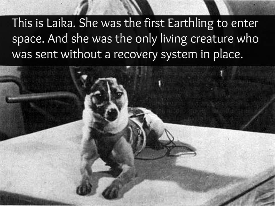 Sputnik 2 orbited a total of 2,570 times. On April 14, 1958, after nearly162 days in orbit, Laika’s craft reentered Earth’s atmosphere and burned. In 1997, the Russians made a monument to honor fallen Soviet cosmonauts. Peering out from behind the statue, an image of the tiny canine. Her name was Laika. She was the first Earthling to enter space, and she was the only living creature who was sent without a recovery system in place.