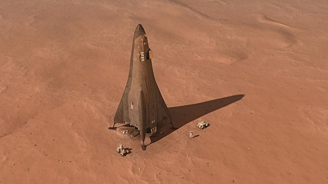 The “refuel-able, restartable, single-stage” craft is capable of approaching the Martian surface at 5 km/s (roughly 3.1 miles per second) and returning to the Mars Base Camp “without being dependent on any surface propellant generation.” It uses aerodynamics to reduce its descent velocity, and best of all, according to the presenters, “We can power this entire spacecraft system just with water.”