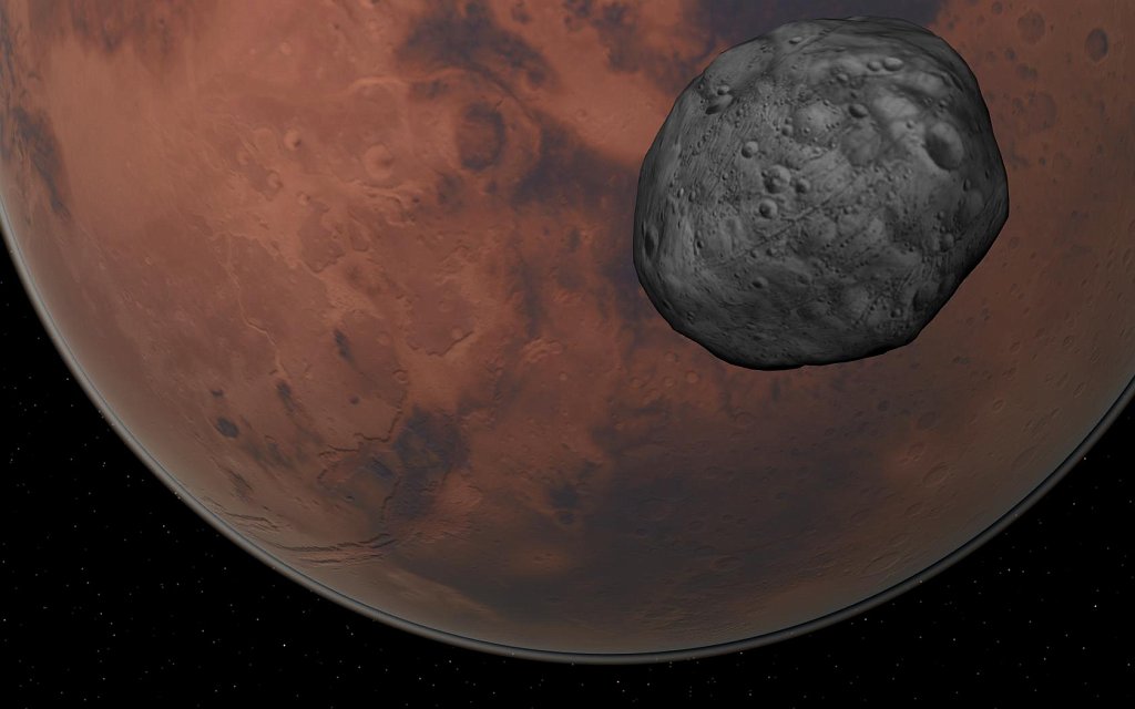 About 6,000 km (3,700 miles) above the Martian surface there’s Phobos, one of Mars’ two natural satellites. It orbits its parent planet like any other moon, except that it does so from a shorter distance than any other (known) moon in our solar system. If one could stand on the surface of the Red Planet and look up into the night sky, Phobos would zoom across the sky in just under 4 hours and 15 minutes.