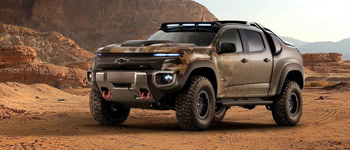 The Chevrolet Colorado ZH2 is a mammoth of a vehicle. It’s almost two meters (6.5 feet) in both height and width, weighs nearly 3,000 kilograms (6,600 pounds), features flared wheel arches, a jacked-up ride, narrow slotted headlights, and a camouflage paint job. The pickup was developed by General Motors and the US Army’s Tank Automotive Research, Development, and Engineering Center (TARDEC).