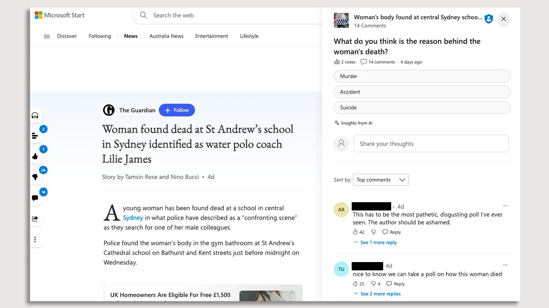 As The Guardian reports in its own recounting of the incident, the article that Microsoft re-published on its MSN news portal focused on the death of a young 20-something woman in Sydney, whose body was found at the school where she worked as a water polo coach.