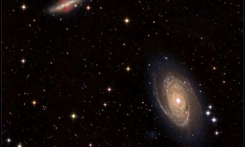 Pair of nearby galaxies with possible intergalactic transfer: This image shows M81 (bottom right) and M82 (upper left), a pair of nearby galaxies where ‘intergalactic transfer’ may be happening. Gas ejected by supernova explosions in M82 can travel through space and eventually contribute to the growth of M81. Image Sourcet: Fred Herrmann