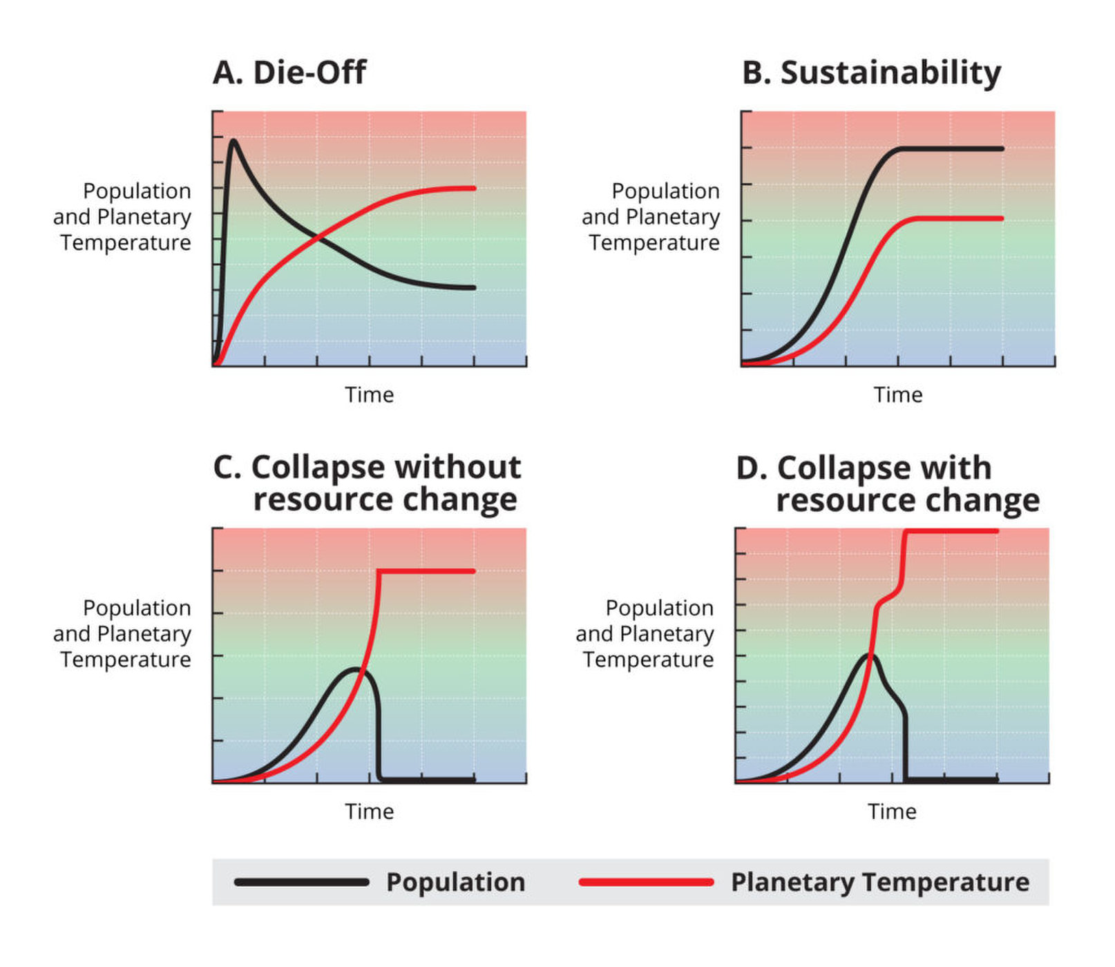 In scenarios C and D, different flavors of “collapse,” growing populations are confronted with steadily rising temperatures. In one case, the civilization continues to grow without adjusting and soon depletes its resources. In the other, the civilization shifts toward sustainability, but the change is too little, too late. Its fate is sealed.