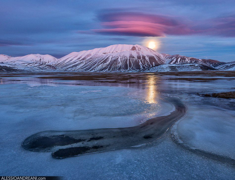 In this absolutely fabulous image, taken by Alessio Andreani, the moon can be seen rising over the snow-capped peaks of Mount Redentore, a member of the Aurunci Mountains in South Pontino, Italy.