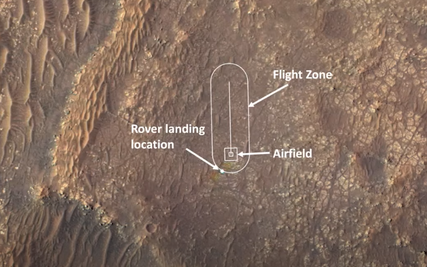 The agency has officially chosen the “airfield” and “flight zone” for Ingenuity. The team at NASA’s Jet Propulsion Laboratory chose the area just north of the Perseverance rover’s landing site. A bird’s eye view shows an elongated zone delineating the area where the tiny four pound helicopter will attempt to fly.