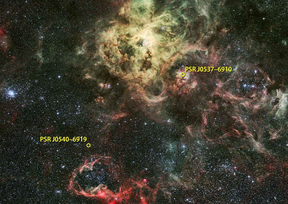 The pulsar is located in the Tarantula Nebula, which can be found inside the Large Magellanic Cloud, a small galaxy that orbits the Milky Way about 163,000 light-years away.