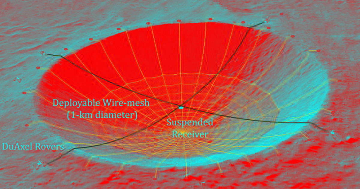 The moonshot proposal — get it? — includes plans for a wire-mesh, a kilometer in diameter, that would be deployed by wall-climbing robots inside a large lunar crater. In other words, the plan is to cast a spider web-like mesh over an existing crater on the far side of the Moon to turn it into a gigantic radio telescope.