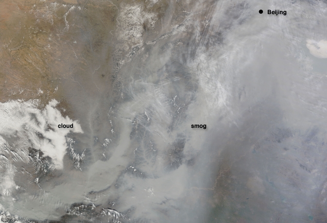 Researchers at NASA (National Aeronautics and Space Administration) and the California Institute of Technology have confirmed that aerial pollution originating in Asia affects cloud development over North America and tends to strengthen extra-tropical cyclones — the storms which strongly influence weather patterns over North America on a weekly basis through the winter and spring. This GEOS-5 (Goddard Earth Observing System Model) animation of global atmospheric aerosols vividly illustrates the issues. The polar jet stream in the northern hemisphere tends to sweep up across China and then hook down across the North Pacific to make landfall generally between Oregon and Alaska on the West Coast. But if you think the West Coast of the United States and Canada have it bad, take a look at poor Japan–You can hardly make out the land mass of the islands because of clouds emanating from China. Of course, it’s never just one factor. Thus, it’s not merely the West Coast of North America that bears the onus of the stronger extratropical cyclonic behavior; the researchers also blame the phenomena for the particularly cold winter that the Eastern United States experienced in 2013. Previous investigations into the impact that Chinese air pollution has on our planet have revealed that a number of the pollutants actually reach the United States, including ozone and sulfates. The combined effect of all of this, this paper estimates, include one extra day of smog each year in the Los Angeles area. Although one extra day of smog, and moderately reduced air quality, in the Western United States might seem a relatively minor annoyance (particularly compared to local pollution sources), it turns out that the real damage may be happening thousands of miles before the pollutants ever reach North American shores. The trend over the past 30 years has been for clouds forming over the Pacific Ocean to become deeper, and storm systems coming in to hit the Pacific Northwest about 10 percent stronger. Scientists first began to suspect that the cause was driven by events in Asia because of the explosive expansion of Asian economies, particularly that of China, during the same period as this increase. The pollution comes in the form of extra particulate matter rising up into the atmosphere. The larger numbers of particles provide a focal point for increased condensation in the storm fronts. That additional condensation releases additional heat energy into those systems, and the additional energy strengthens the storm, fueling the convective process of cloud formation. Although the current round of experimentation with the data only reveals the impact that this has on North America, the researchers are also planning new experiments to determine whether or not the pollution is affecting the climate globally. According to this NASA article, preliminary results suggest that the answer is “yes.” This could have a far reaching impact on how we understand the biosphere, and how we confront and combat climate change. As the NASA release notes: “The work should raise even more red flags about aerosol-based geoengineering solutions — interventions in the Earth system intended to counteract global warming. Some groups have suggested that we could inject sulfate aerosols into the stratosphere to block incoming sunlight, but Jiang and Wang found that sulfates are the most effective type of aerosol for deepening extratropical cyclones. Ongoing injections would bring more stormy winter weather globally and would likely change the climate in other ways we cannot yet foresee.” Below is an image taken by FQTQ writer Jolene Creighton, who visited Beijing this past summer (July 2015). She snapped a few images as she was flying out of the city, and they clearly show the smog-choked land resting beneath the clearer sky above. Image credit; Jolene Creighton written by FQTQ contributor Scott Wilson