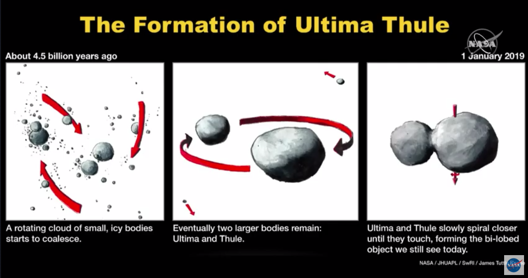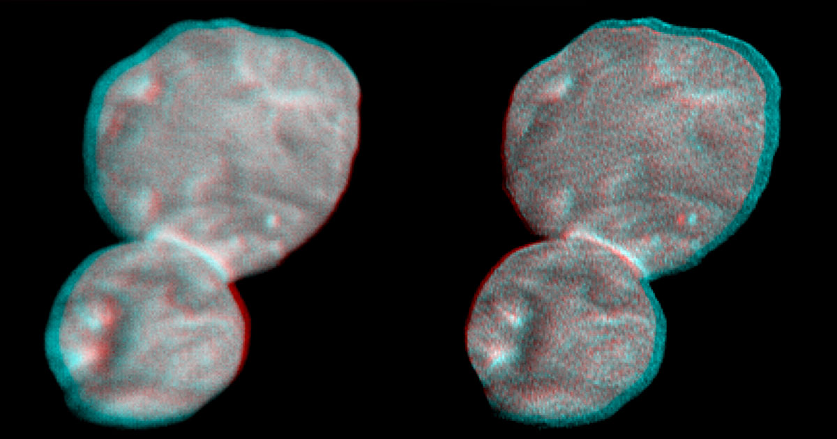 We don’t know much about why it’s this shape, but we can make some educated guesses: rotating cloud of small rocks could start to spin around each other, two of which could start getting closer and closer, until they finally touch — not colliding but slowly pressing into each other — forming a “bi-lobed object,” as NASA’s New Horizons Co-Investigator Jeff Moore put it.