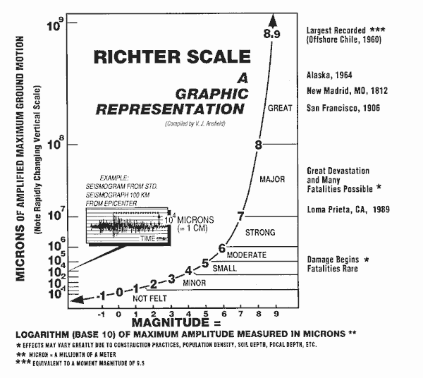 One of the first attempts at a scale on which to measure the intensity of an earthquake is the much criticized Mercalli scale. But the scale doesn’t use a quantitative form of measurement to use to assign a ‘level.’ Instead, it takes the very subjective route of using the effects to measure its power. For example, level 2 is ‘Weak’, described as only being felt by a couple of sensitive people and causing suspended objects to swing slightly. For scientists, this was just not accurate enough. Soon after we developed the Richter scale. It measures the energy released during an earthquake on a logarithmic scale; so 7 is 10 times more powerful than 6 (with 30 times more energy). In many countries this has also been abandoned by scientists for the moment magnitude scale, which is based on many more factors associated with the fault and the local geology. But because of its similarity to the Richter scale and the public’s preference for the Richter scale, the units are often converted to match it.