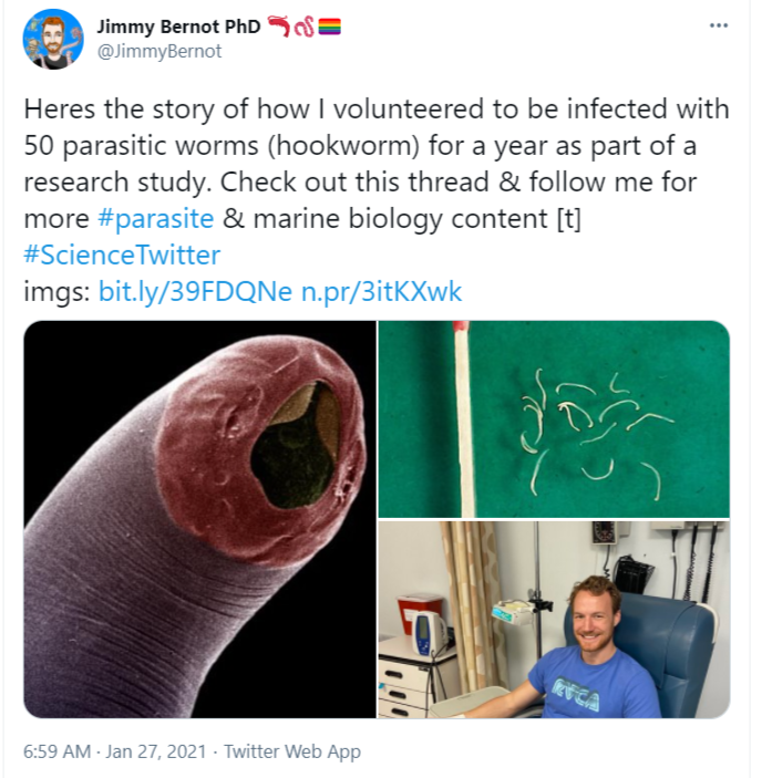 “Here’s the story of how I volunteered to be infected with 50 parasitic worms (hookworm) for a year as part of a research study,” he tweeted at the start of a long thread about the experience.