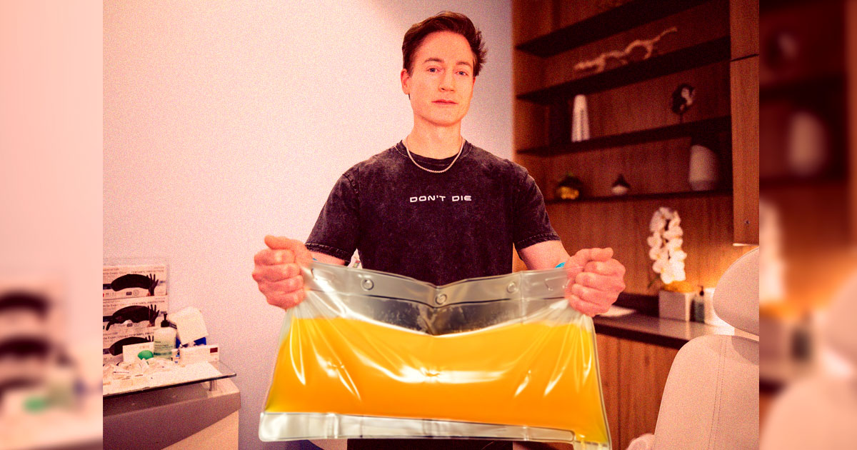 Johnson shared a photo of himself brandishing a plastic sac bulging with yellow viscous goo, which he claims to be that indispensable component of blood, looking as uncannily youthful as ever.