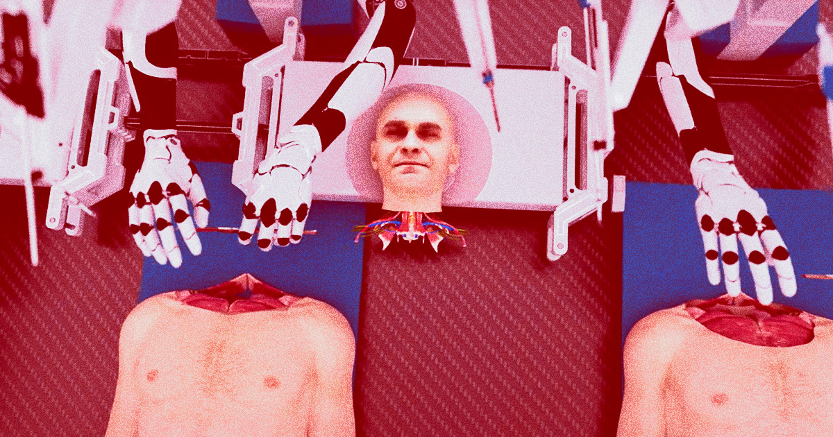 Hashem Al-Ghaili, a biologist and filmmaker, presents in the video a gory yet goofy illustration of how the bizarre experiment could be carried out: two identical autonomous robots, each with multiple arms, would simultaneously operate on the healthy brain-dead donor body and the presumably worn-out body that’s the source of the head and brain.