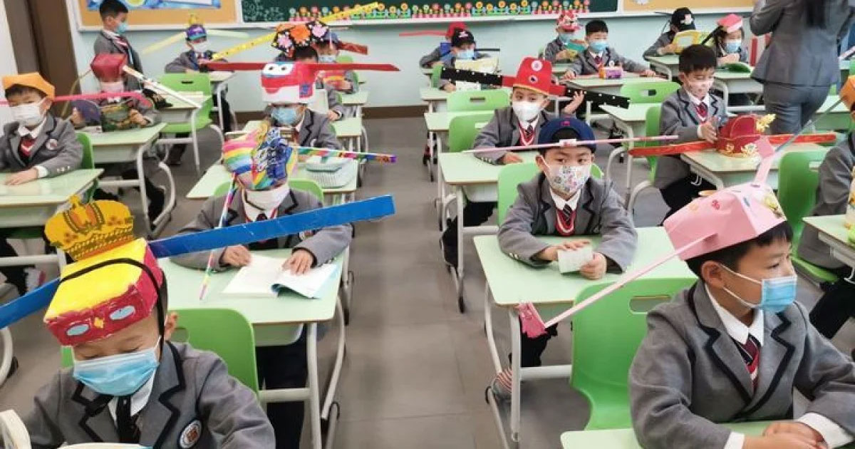 Images recently uploaded to Chinese social media show school children wearing adorable hats with two long protrusions on either side, to encourage social distancing, CNET reports.