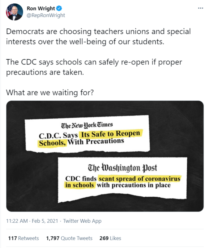 Wright’s final votes as a U.S. representative, CNBC reports, were to oppose the second impeachment against former President Donald Trump and to object against the electoral vote counts from Pennsylvania and Arizona. He also tweeted in favor of opening up American schools for in-person learning just days before he ultimately passed — which is ironic, in a dark way, since the virus subsequently kill him.