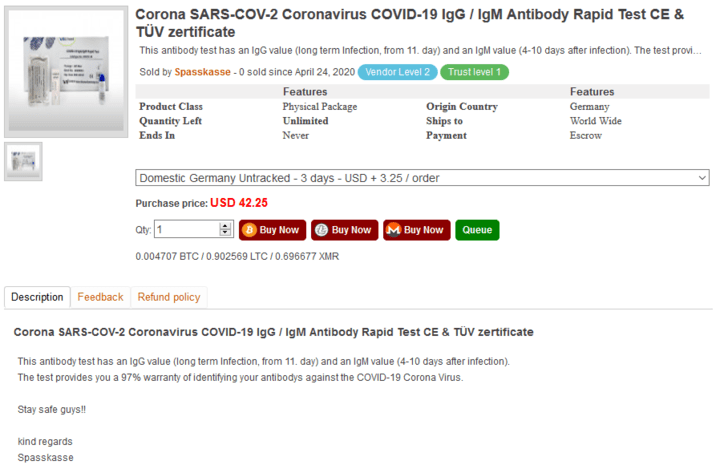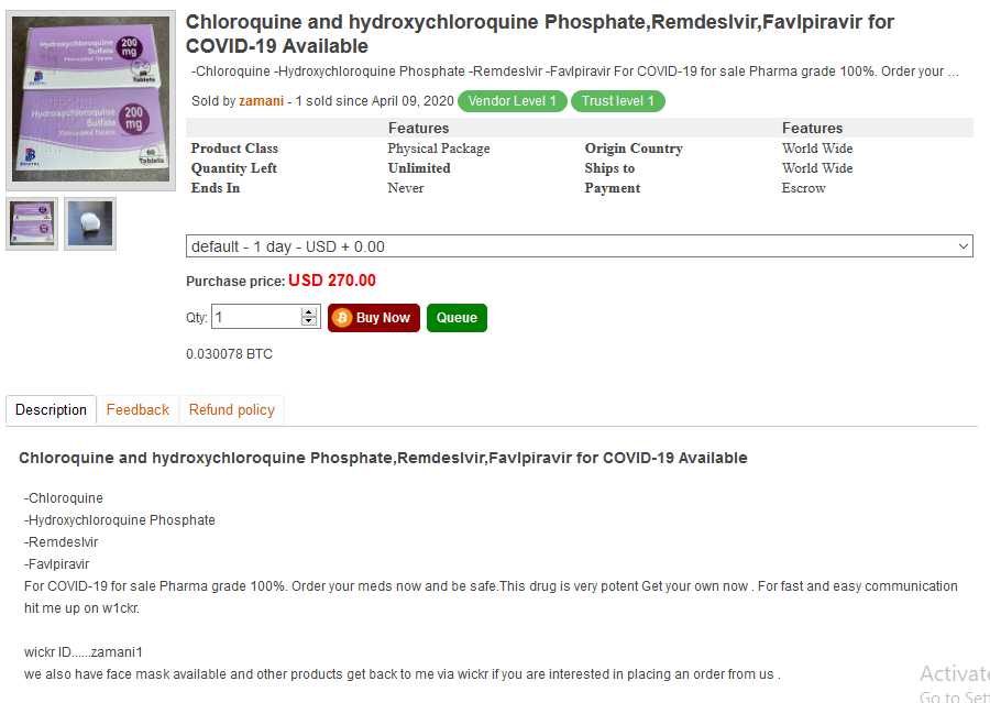 But that’s not true on the dark web, an anonymous version of the internet you can only access using encrypted browsers like Tor. On darknet marketplaces, infamous for selling drugs and weapons in exchange for cryptocurrency, vendors are hawking what they say are COVID-19 treatments like hydroxychloroquine and remdesivir, as well as diagnostic tests for the disease.