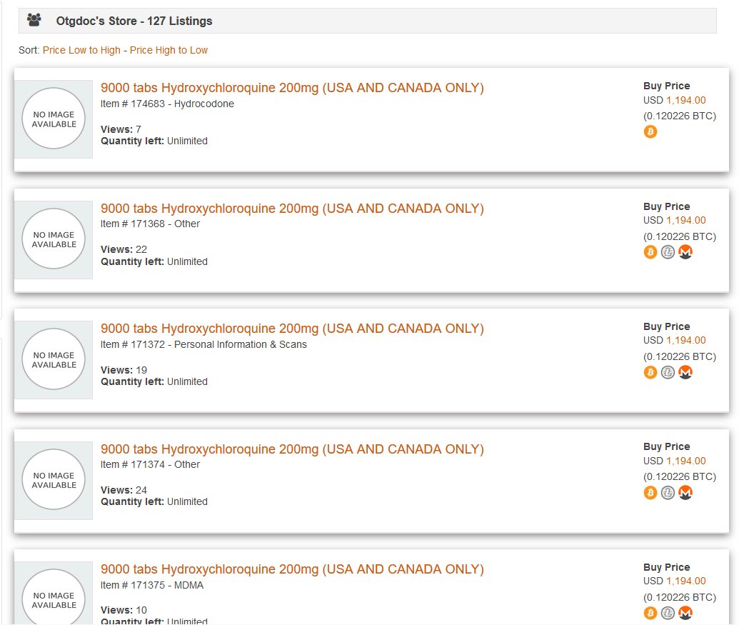 As previously reported by the Daily Beast, most of the coronavirus-related products for sale on the dark web seem to be hydroxychloroquine. That’s the anti-malarial drug that U.S. President Donald Trump and others in the federal government repeatedly pushed, without evidence, as a treatment for the coronavirus — and which researchers now say is an ineffective and unsafe medication for it.