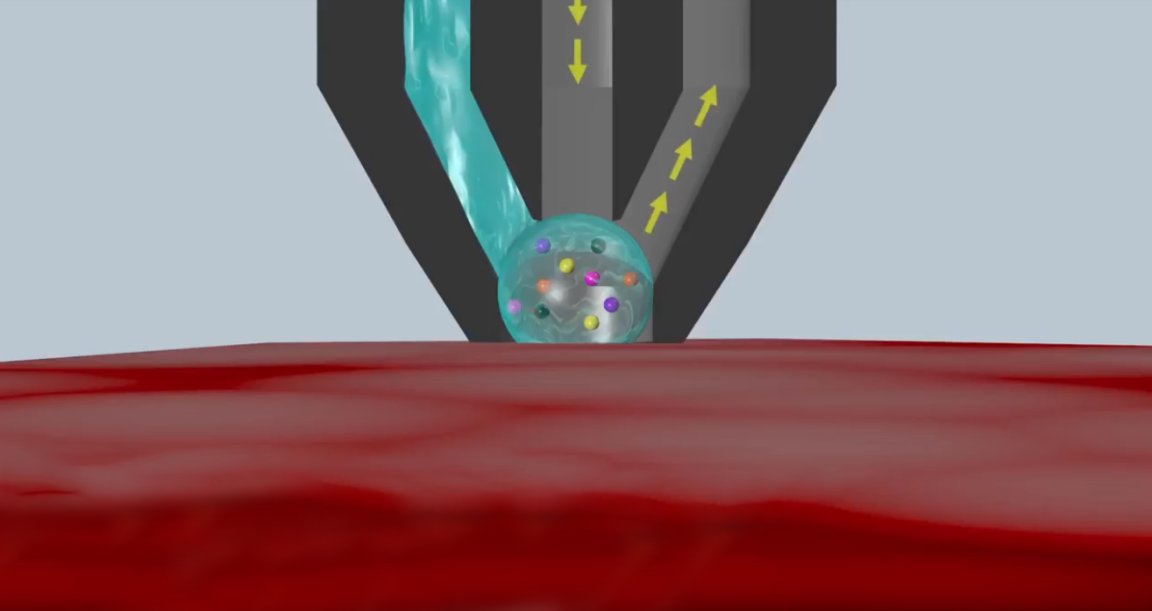 According to an article published Wednesday in the journal Science Translational Medicine, the tip of the MasSpec Pen has three ports: one for water to extract a tissue sample, a vacuum chamber to feed the sample into a machine called a mass spectrometer, and another of gas (nitrogen, carbon dioxide, or air) to prevent the system from collapsing from the pressure of the vacuum. A tiny water droplet encapsulates a few molecules of tissue and is fed into the machine where it is broken into molecules. The molecules are then given a charge and sorted by mass.