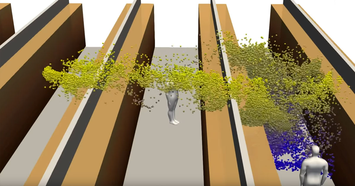 “In the 3D model, a person coughs in a corridor bounded by shelves under representative indoor ventilation air flow conditions,” reads the video. “As a result of coughing, an aerosol cloud travels in the air to the corridor. It takes up several minutes for the cloud to spread and disperse.”