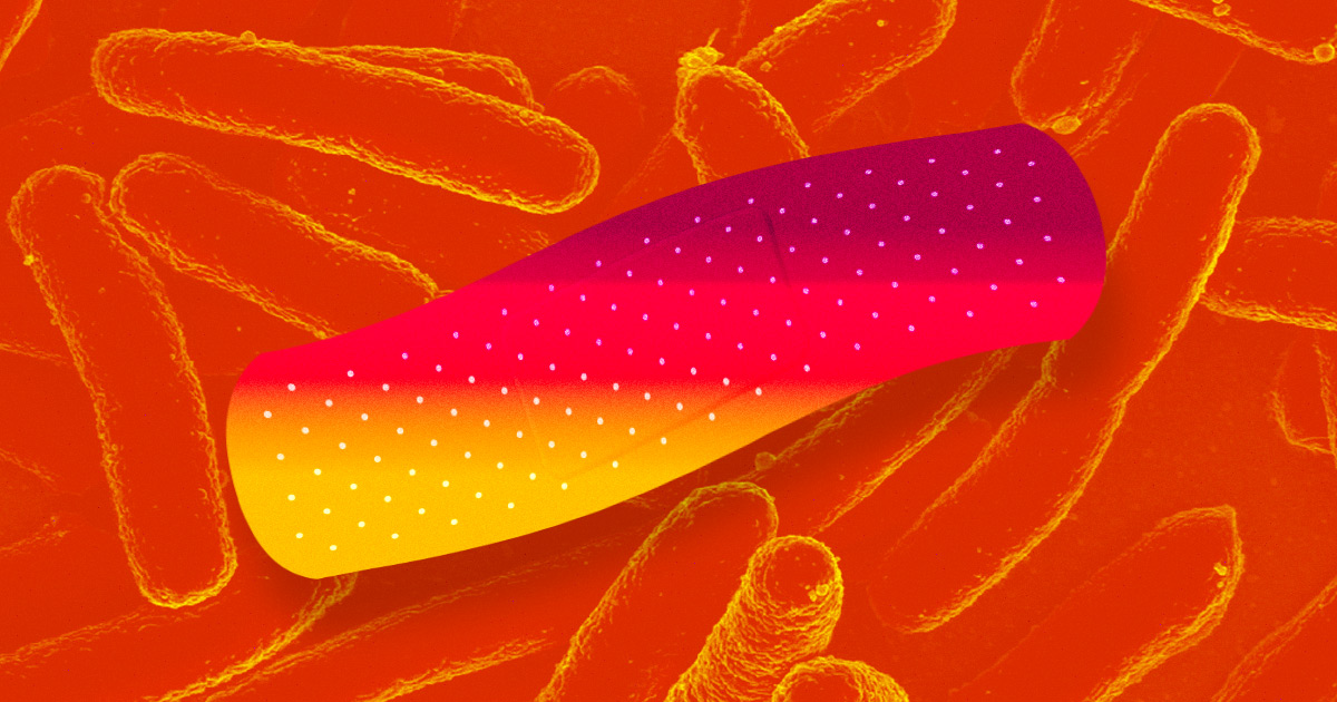 And if the bandage senses the presence of drug-resistant bacteria — the kind that traditional antibiotics alone can have trouble killing — it releases the antibiotic and turns red. As that point, doctors can shine a light on the bandage, which causes the material to release special molecules that can kill the bacteria or at least weaken it enough to improve the efficacy of the antibiotic.