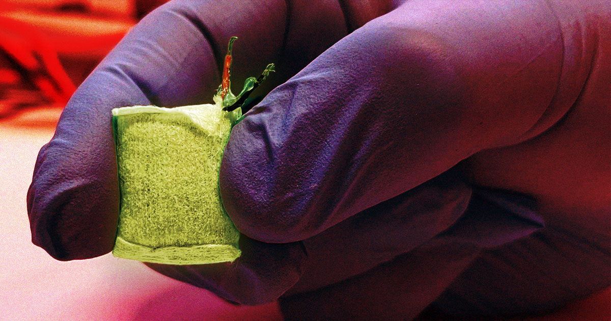 Copper-based nanoparticles of the tea bag device split glucose into gluconic acid as well as a proton that forms an electric circuit. A fabric made of alginate, a medical-use-approved material, which is derived from algae, allows the implant to soak up body fluid and provides a steady stream of glucose fuel.