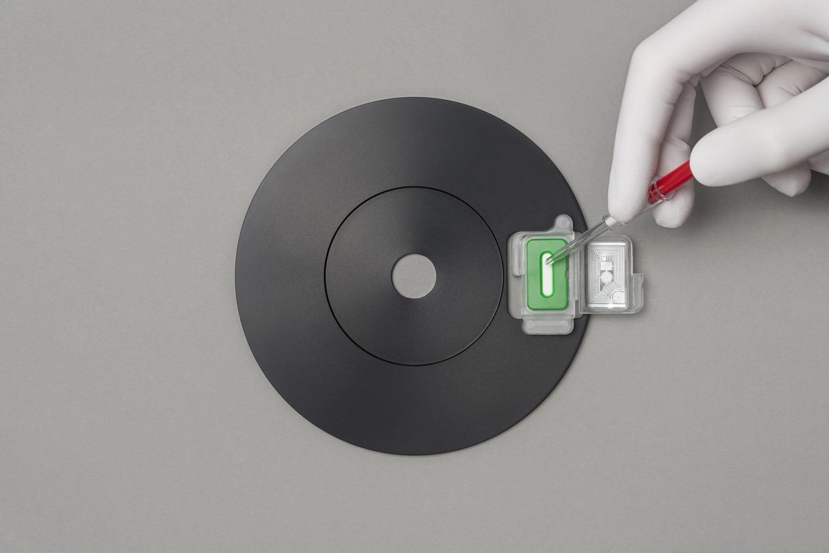 The blood, combined with a chemical reagent, is fed to the testing device on a DVD-like mounting plate. That combination forms specific molecular complexes as the sample interacts with biosensors from the capsule. The complexes are then optically detected using an integrated laser. The initial results appear on a high-resolution touch screen in just five minutes, with the full results saved on an Abionic-provided SD card.