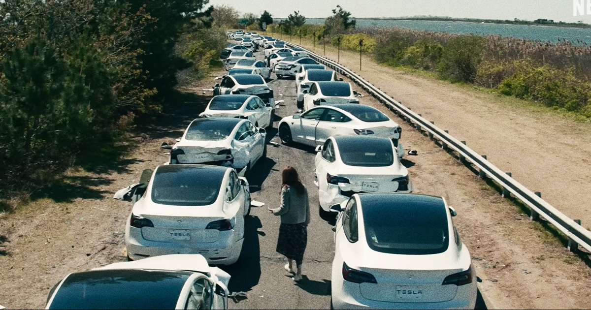 In the scene, which like the film is set in a Long Island town near a peri-apocalyptic New York City, Roberts’ perturbed character surveys a pileup of empty white Tesla Model 3s. She realizes that all the electric vehicles have dealer stickers still on them, meaning they’re all new.
