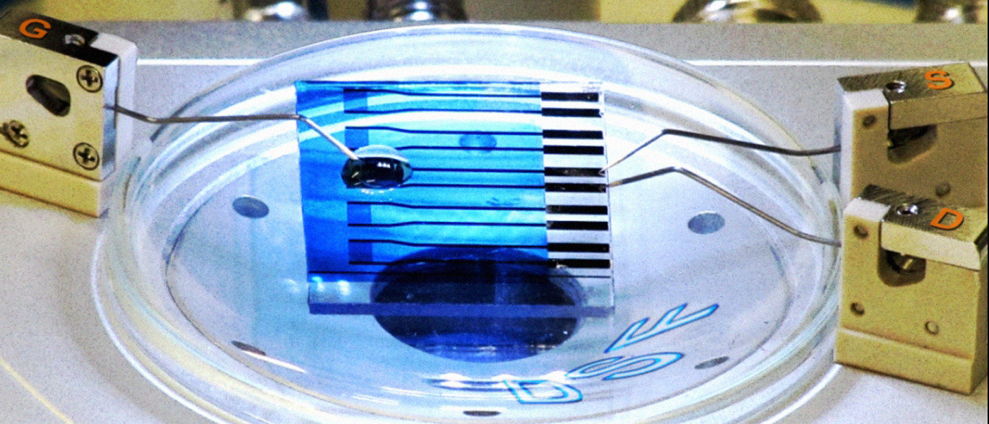 The tiny tool is an electronic device which basically consists of an organic transistor on a glass scale exposed to a liquid medium.