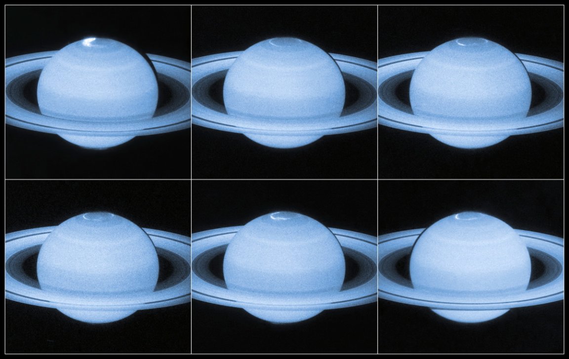 In this series of images, we can see the ethereal flashes of Saturn’s northern lights as they dance across the upper atmosphere of the gas giant. The ultraviolet images released from the European Space Agency (ESA) show the impact that streams of highly energized particles shot out by the Sun have on Saturn’s magnetic field.