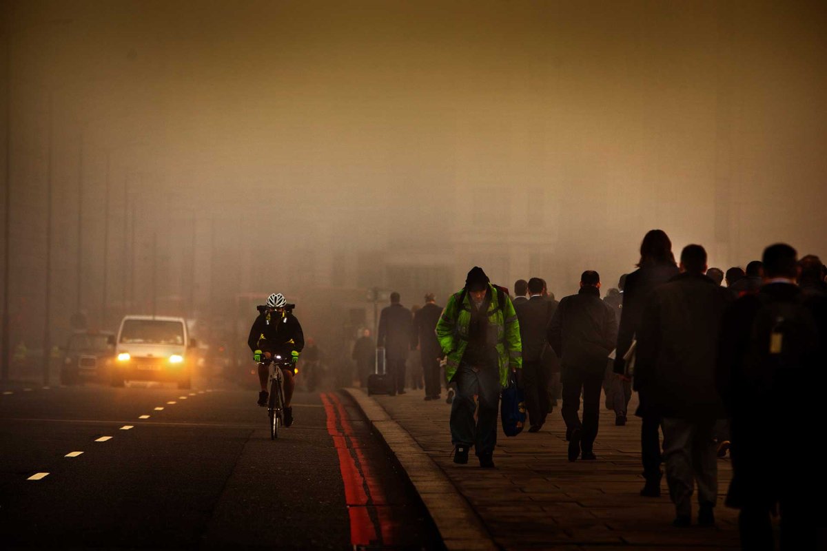 Commuters can be seen crossing the London Bridge on March 15, 2012 — a day with record-breaking levels of air pollution due to dirty air from the north, traffic fumes, and a lack of moving air. According to the World Health Organization, “92% of the world population was living in places where the WHO air quality guidelines levels were not met,” and three million premature deaths were caused by ambient air pollution worldwide in 2012.