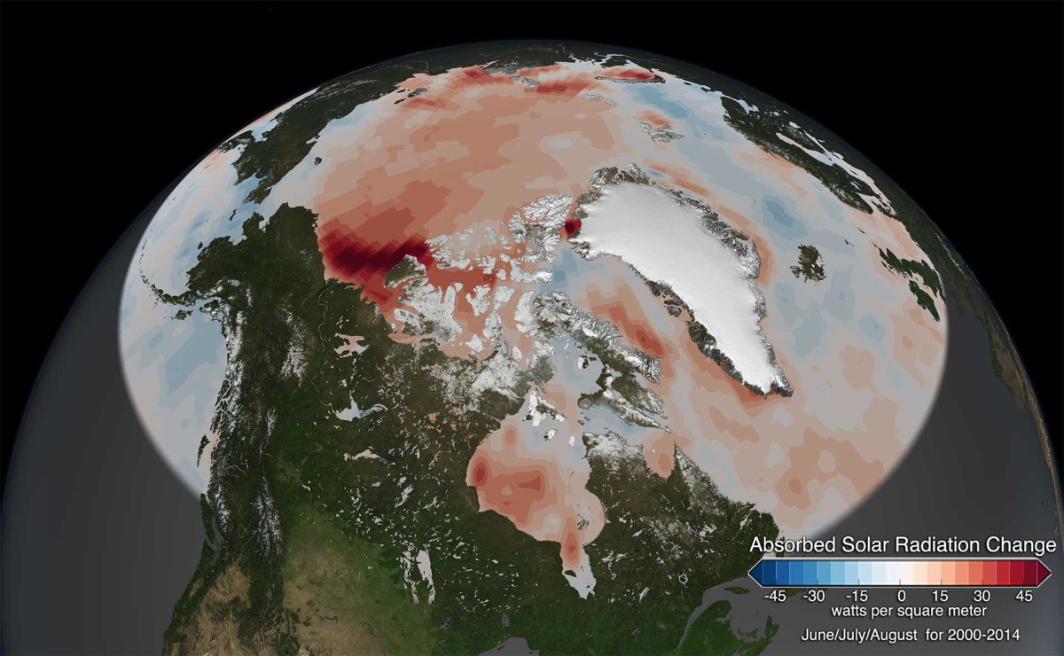 Since 2000, NASA has been using its satellites to measure the solar radiation absorbed in the Arctic. Since records began in 2000, the rate has increased by 5% — notably, the only region on our planet to see a change. Due to this increase, the ice melts sooner in the spring, and more older, thicker sea ice is lost permanently.