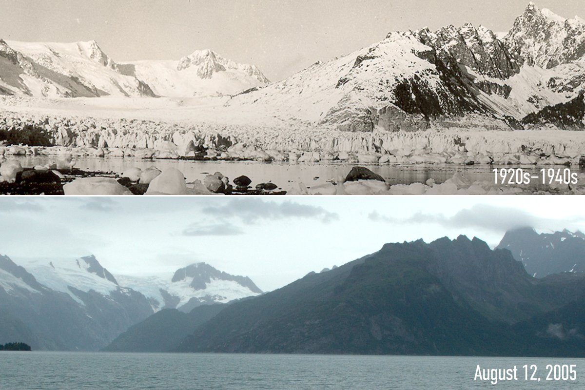 The Northwestern Glacier in Alaska retreated an estimated 10 kilometers (6 miles) out of view. The small icebergs that can be seen in the foreground have retreated almost entirely throughout the decades.