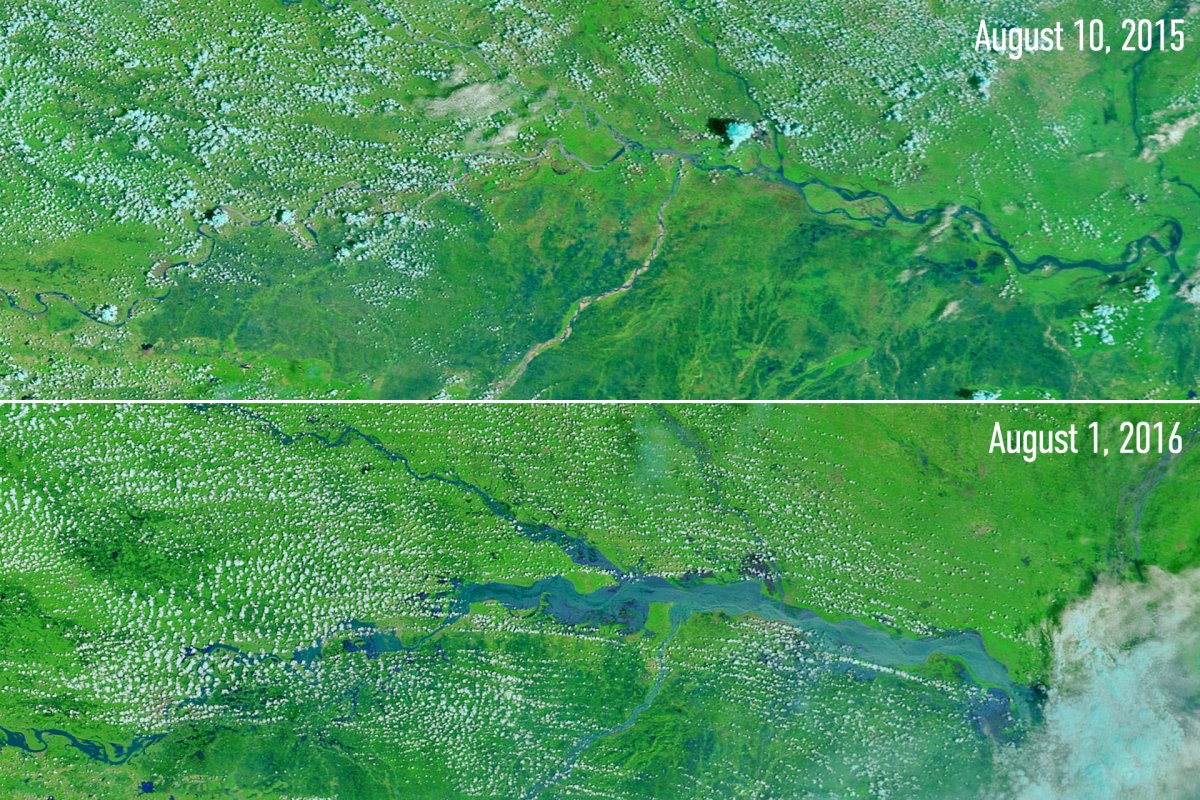 These satellite images are part of an ongoing series of images called Images of Change released by NASA in 2017. In addition to images related to climate change, the series also looks at how urbanization and natural hazards are changing our planet. The two images above show the drastic effect the 2015 flood had on the Ganges River in eastern and central India. Over six million people were affected by it, and at least 300 people lost their lives.