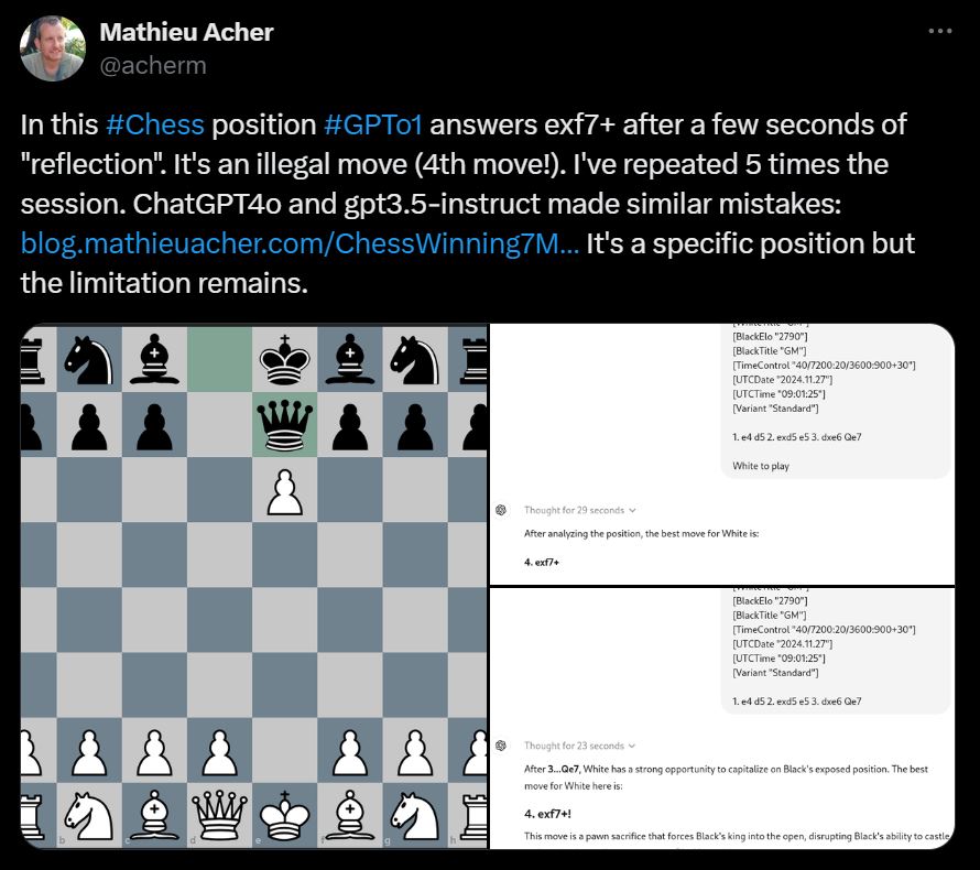 For instance, INSA Rennes researcher Mathieu Acher found, it’s still repeatedly suggesting illegal chess moves in response to certain puzzles.