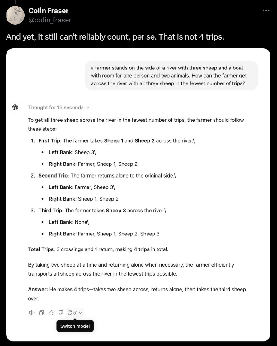 Tasks as basic as counting also remain elusive. In one example flagged by Meta AI scientist Colin Fraser, Strawberry attempts to take on a rudimentary word puzzle about a farmer transporting sheep across a river — and accidentally abandons the correct answer in favor of illogical garble at the end.