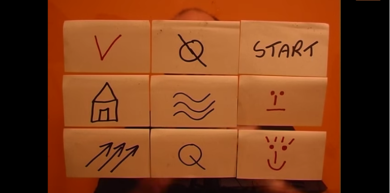 So the first time that he counts, he goes up to seven.To get to the house (the first one that is removed), it requires an even number of moves, and once at the house, you can only return to the house using an even number of moves (if he ends on an even number). Since he does not end on an even number, we know that you cannot be on the house. Thus, he just as easily could have picked any other card that it takes an even number of moves to get to and removed them (the “apathetic face” or the “Q” also could have been removed).