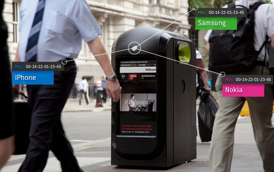Cities are also gathering real-time data that does focus on individuals. In 2013, a company called Renew London piloted a program in which sensors installed in recycling bins tracked the wifi signals from passing phones. The sensors could then use the phone’s unique media access control (MAC) address to target advertisements on that bin to the individual, based on his or her movement within the sensor network. For example, if the individual had frequently passed a particular clothing store or restaurant, he or she might see more ads for that establishment.