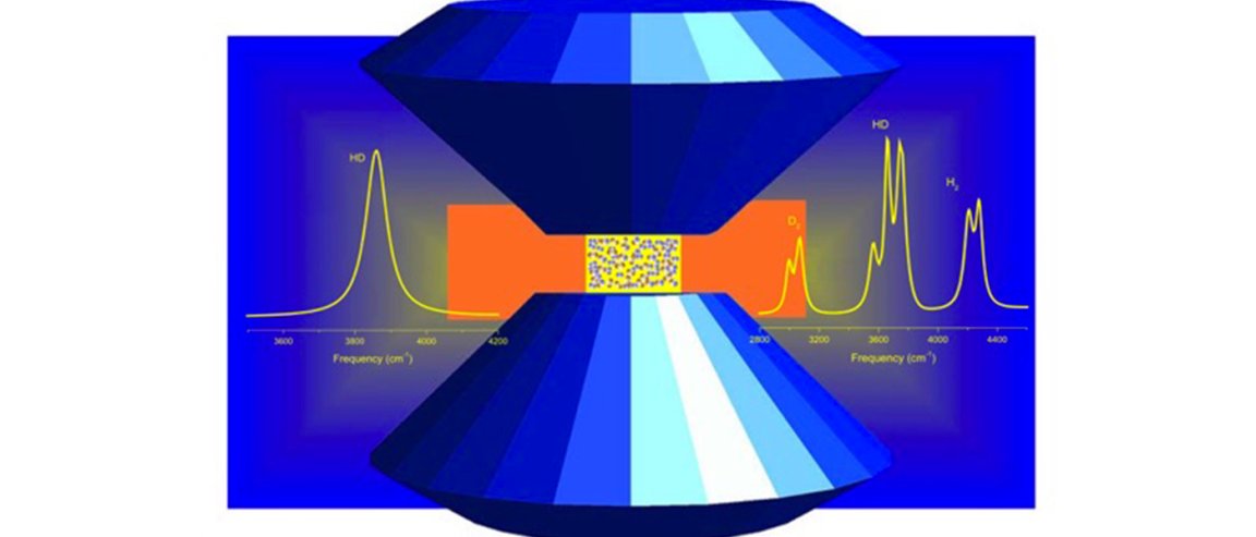 In this research, solid hydrogen deuteride (HD) was pressed with extreme pressure at 3.4 megabars, which is very very close to the pressure at the center of the Earth (3.6 megabars), using a diamond anvil cell.